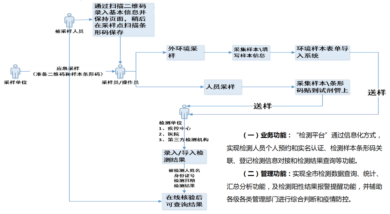 (一(yī))業(yè)務功能(néng): "檢測平台”通(tōng)過信息化(huà)方式,實現(xiàn)檢測人(rγén)員(yuán)個(gè)人(rén)預約和(hé)實名認證、檢測樣本條形碼關聯、登記檢測信息對(duì)接和(hé)檢測結果查詢等功能(néng)。