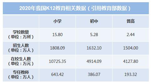2020年(nián)我國(guó)K12教育相(xiàng)關數(shù)據(引用(yòng)教育部數(shù)據):K12學校(xiào):21.08萬所,招生(shēng)人(rén)數₹(shù):3440.19萬人(rén),在校(xiào)生(shēng):1.56億人(rén),