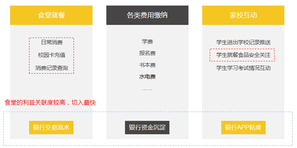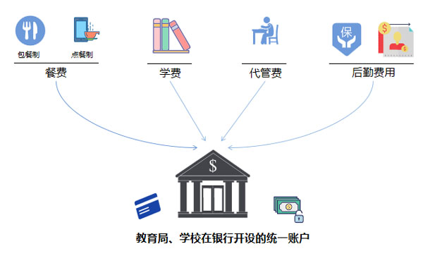 學校(xiào)統一(yī)賬戶(餐費(fèi)等統一(yī)繳納),後勤供應商資金(jīn)結算(suàn)及資金(jīn)存放(fàng)。