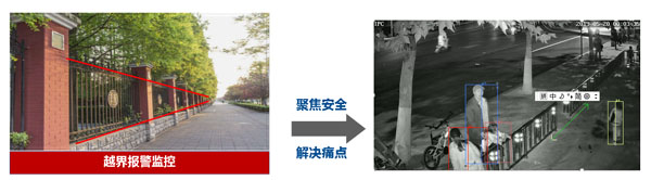通(tōng)過AI賦能(néng)周界視(shì)頻(pín)監控,實現(xiàn)可(kě)疑 人(rén)員(yuán)越界分(fēn)析、晝夜可(kě)視(shì)、智能(néng)态勢分(fēn)析、報(bào)警聯動等功能(néng)。可(kě)廣泛應用(yòng)于校(xσiào)園、宿舍周界、危險區(qū)域(高(gāo)樓、人(rén)工(gōng)湖(hú))等場(chǎng)景,實現(xiàn)越界報(bào)警監控及預警。
