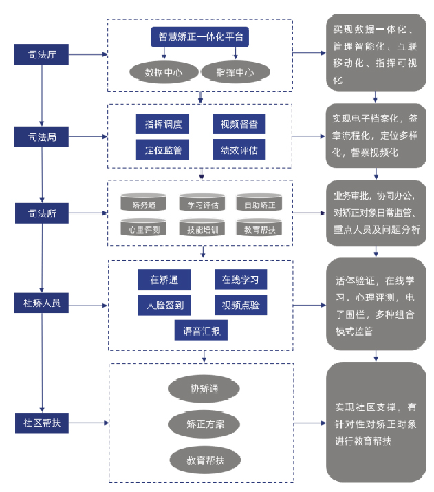 同時(shí)平台以業(yè)務信息化(huà)應用(yòng)與管理(lǐ)制(zhì)度相(xiàng)融合的(de)機(jī)制(zhì),實現(xiàn)社區(qū)矯"正業(yè)務信息 全面化(huà),管理(lǐ)水(shuǐ)平智能(néng)化(huà),社區(qū)矯正工(gōng)作(zuò)便捷化(huà),從(cóng)根本上(shàng)解決了(le)城(chéng)鄉(xiāng)基層各 司法所、街(jiē)道(dào)辦人(rén)員(yuán)不§(bù)足,工(gōng)作(zuò)手段少(shǎo),管理(lǐ)措施有(yǒu)限等問(wèn)題,夯實了(le)城(chéngπ)鄉(xiāng)基 層司法服務能(néng)力。