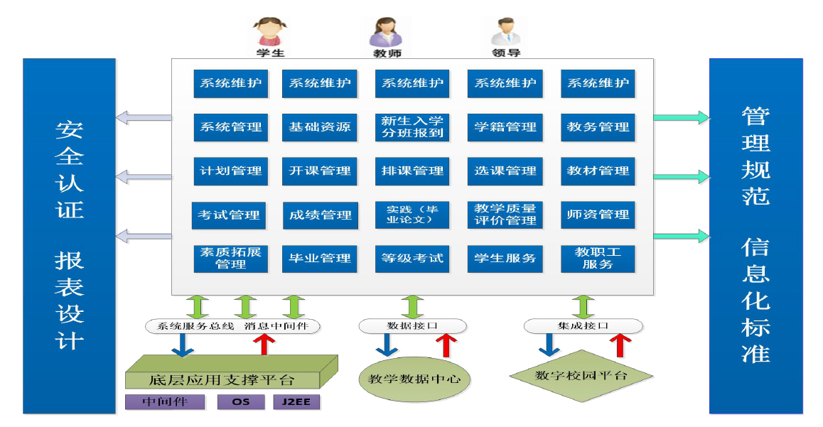 教學服務系統對(duì)“教(課程建設與管理(lǐ))”和(hé)“學(人(rén)才培養方案管理(lǐ))”兩個(gè)核心本質進行(xíng)科(kē)學解構、有(yǒu)機(jī) 關聯,通(tōng)過剖析人(rén)才培養理(lǐ)念,挖掘教學管理(lǐ)業(yè)務,将數(shù)據治理(lǐ)理(lǐ)念深度融入到(dào)人(rén)才培養管理(<lǐ)中,實現(xiàn)了(le)在教學管理(lǐ)上(shàng)以課程為(wèi)核心、在學生(shēng)管理(l‌ǐ)上(shàng)以人(rén)才培養方案為(wèi)核心的(de)雙核心管理(lǐ)模式,将整個(gè)教學管理(lǐ)數(shù)據條理(lǐ)化(huà)、精細化(huà)、一(§yī)體(tǐ)化(huà),真正具備了(le)智慧教務的(de)大(dà)數(shù)據框架,不(bù)僅可₹(kě)以高(gāo)效完成常規教學管理(lǐ)工(gōng)作(zuò),同時(shí)也(yě)能(néng)夠很(hěn)好(hǎo)的(de)适應各種教育改革與創新。