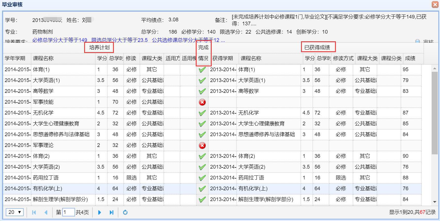 随著(zhe)學分(fēn)制(zhì)的(de)推廣,人(rén)才培養模式越來(lái)越靈活,傳統的(de)僅按學分(fēn)進行(xíng)審核會(huì)帶來π(lái)一(yī)系列的(de)問(wèn)題:如(rú)轉專業(yè)學生(shēng)會(huì)出現(xiàn)學分(fēn)足夠但(dàn)部分(fēn)必修課程未修讀(d✘ú)。這(zhè)就(jiù)要(yào)求畢業(yè)審核能(néng)夠完全實現(xiàn)了(le)對(duì)學生(shēng)培養計(jì)劃完成情況的(de)審核,如<(rú):必修課須逐門(mén)審核,選修課(限選)按學分(fēn)審核,以保證畢業(yè)審核的(de)嚴謹性和(hé)嚴肅性!系統實現(xiàn)了(le)主/輔修畢業(yè)、®學位的(de)一(yī)鍵審核功能(néng),全面審核學生(shēng)的(de)學業(yè)修讀(dú)情況,得(deΩ)出審核結論,實現(xiàn)畢業(yè)審核的(de)系統化(huà)、自(zì)動化(huà)、日(↕rì)常化(huà)。