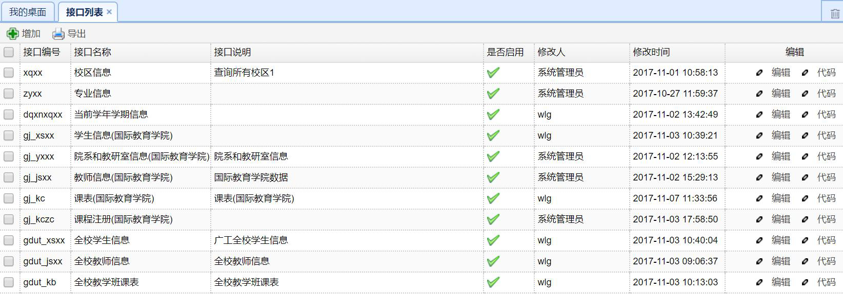 系統提供界面化(huà)的(de)接口定制(zhì)平台,為(wèi)各類接口的(de)定制(zhì‌)與産生(shēng)提供了(le)方便。非開(kāi)發人(rén)員(yuán)也(yě)可(kě)以根據需求自(zì)定義添加定制(zhì)各種數(shù)據接口,數 (shù)據可(kě)來(lái)源于系統數(shù)據庫中的(de)任意一(yī)張表任意字段,并支持指定接口的(de)調用(yòng)方。