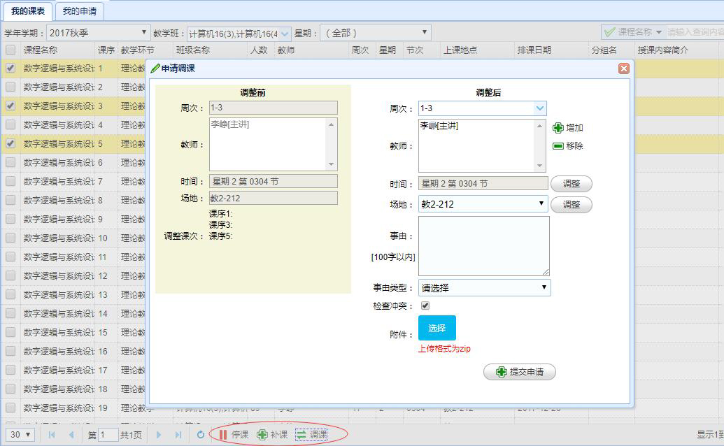如(rú)下(xià)圖:教師(shī)在線申請(qǐng)調課、停課、補課,完成審核流程後實時(shí)更新課表