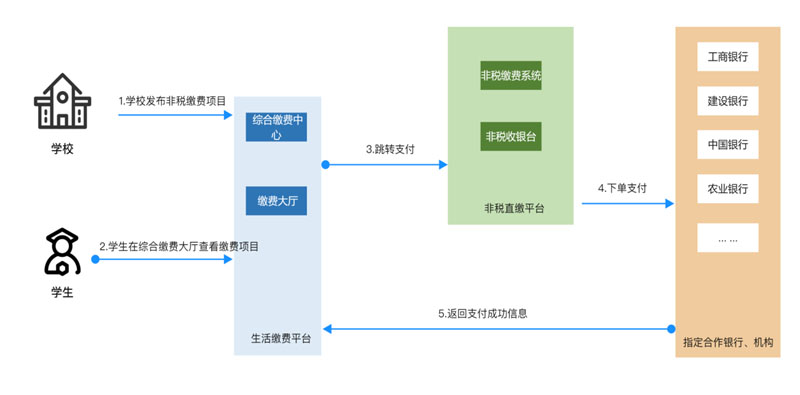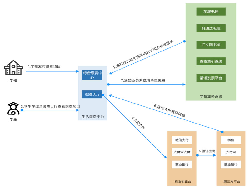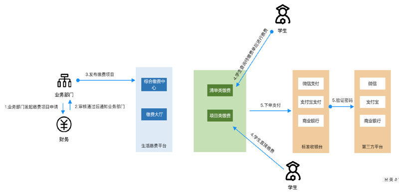 生(shēng)活繳費(fèi)平台支持接入非學校(xiào)經營的(de)生(shēng)活熱(rè)水(shuǐ)、洗衣機(jī)等項​目,支付最終結算(suàn)入賬賬戶學校(xiào)不(bù)管理(lǐ),但(dàn)所有(yǒu)支付交易記錄需要(yào)通(tōng)過支付平台進 行(xíng)記錄,生(shēng)活繳費(fèi)平台能(néng)統計(jì)支付數(shù)據,同步到(dào)學校(xiào)的(de)統一(yī)繳費(fèi)平台。