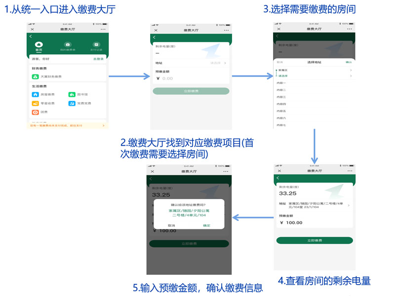 電(diàn)費(fèi)繳費(fèi)一(yī)般由專門(mén)的(de)電(diàn)表機(jī)具對(duì)公寓寝室的(de)房(fáng)間(j✔iān)用(yòng)電(diàn)進行(xíng)計(jì)費(fèi),通(tōng)過手抄表導入或直接上(shàng)報(b ào)電(diàn)控系統的(de)方式每月(yuè)生(shēng)成該房(fáng)間(jiān)的(de)電(diàβn)費(fèi)單,然後由用(yòng)戶登錄在線繳費(fèi)大(dà)廳對(duì)房(fáng)間(jiān)的ε(de)電(diàn)費(fèi)單進行(xíng)繳費(fèi)。還(hái)有(yǒu)一(yī)種預充值方式的(de)電(diàn)費(fèi)繳費(fèi),用(yòngλ)戶登錄在線繳費(fèi)大(dà)廳查詢指定房(fáng)間(jiān),支持查詢房(fáng)間(jiān)的(de)剩餘電(diàn)量,自(zì)定義輸入繳φ納金(jīn)額,支持使用(yòng)預付費(fèi)錢(qián)包餘額、第三方支付平台金(jīn)額,*未來(lái)希望能(néng)直接使用→(yòng)數(shù)字貨币錢(qián)包金(jīn)額進行(xíng)支付,支付成功後用(yòn✔g)戶可(kě)以在支付記錄裡(lǐ)查看(kàn)到(dào)本次繳費(fèi)的(de)支付詳情。後台系統會(huì)在每天淩晨2點結算(suàn)前一(yī)日(rì)的(de)電(↔diàn)費(fèi)項目繳費(fèi)總額,生(shēng)成統計(jì)報(bào)表。