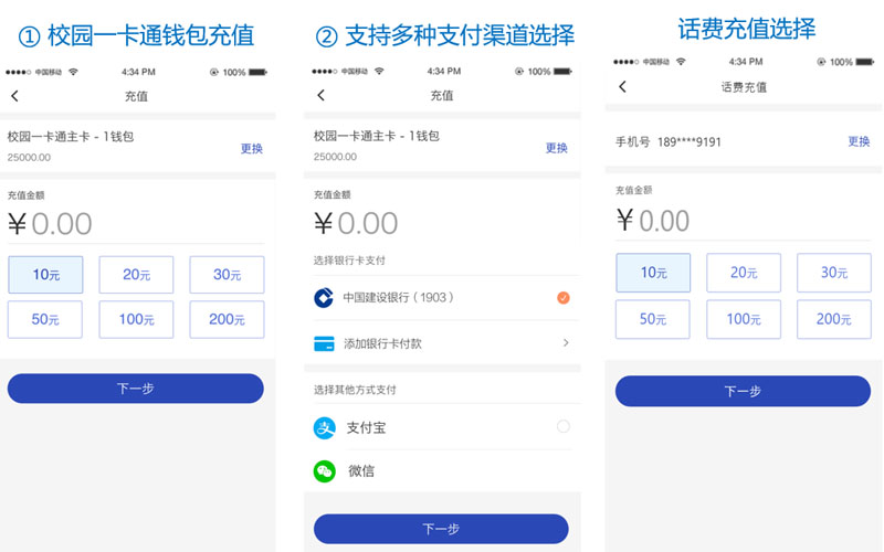 充話(huà)費(fèi)作(zuò)為(wèi)校(xiào)園生(shēng)活最常用(yòng)的(de)功能(néng),快(kuài±)速便捷是(shì)首要(yào)。生(shēng)活繳費(fèi)平台支持對(duì)接三大(dà)運營商,通(tōng)過創建“話(huà)費(fèi↓)充值”項目配置啓用(yòng)運營商參數(shù),支持啓用(yòng)單個(gè)運營商。老(lǎo)師(shī)可(k€ě)以設置每次充值的(de)金(jīn)額範圍以及快(kuài)捷選擇金(jīn)額,學生(shēng)進入話(huà)費(fèi)充值頁面首次需輸入手機(jī)号,之§後會(huì)記住上(shàng)次充值的(de)手機(jī)号,實現(xiàn)一(yī)鍵充值。