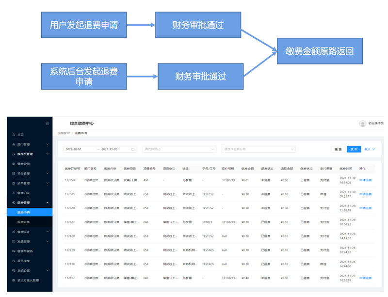 常規線上(shàng)繳費(fèi)退費(fèi):常規線上(shàng)退費(fèi)可(kě)以根據不(bù)同項目場(chǎng)景配置不(bù)同流程。