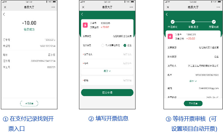 支持由用(yòng)戶發起開(kāi)票(piào)申請(qǐng),财務審批通(tōng)過後用(y∏òng)戶可(kě)以在支付詳情查看(kàn)開(kāi)票(piào)信息、下(xià)載電(diàn)子(zǐ)發票(piào)。