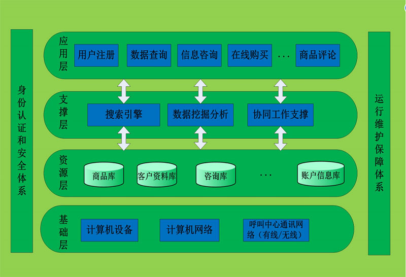 基礎層是(shì)平台的(de)基本構架環境,包括數(shù)據庫服務器(qì)、應用(yòng)服務器(qì)/Web 服務器(qì)、交換機(jī)、存儲設備、計(jì)÷算(suàn)機(jī)網絡、呼叫中心接入、有(yǒu)/ 無線通(tōng)訊服務等。