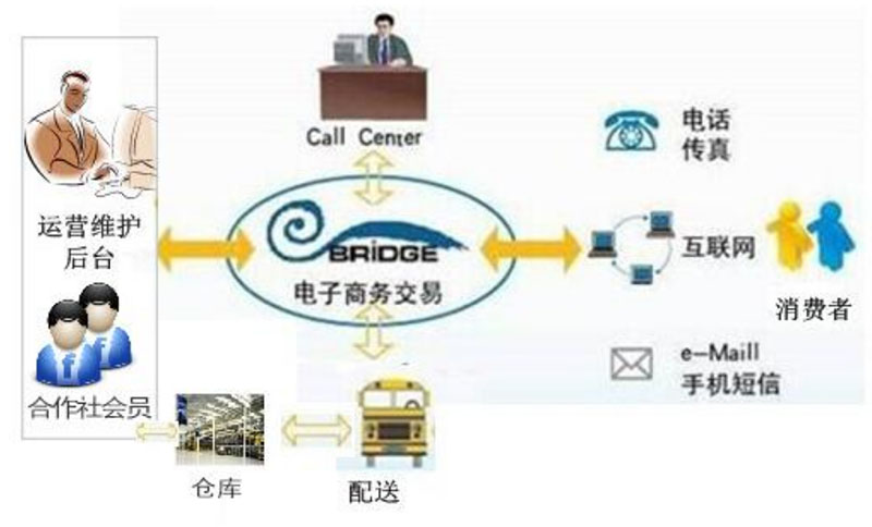 3.2 業(yè)務架構 如(rú)下(xià)圖 3.2-1 所示,合作(zuò)社會(huì)員(yuán)将商品介紹和(hé)Ω在線貨量等信息在電(diàn)子(zǐ)商務交易平台上(shàng)發布,消費(fèi)者通(tōngσ)過互聯網訪問(wèn)交易平台,在找到(dào)滿意的(de)産品後進行(xíng)在線訂購(gòu),通(tōng)過網絡銀(yín)行(xíng)↑支付,訂單信息發送到(dào)物(wù)流 商系統,完成貨物(wù)配送。消費(fèi)者也(yě)可(§kě)以通(tōng)過呼叫中心與服務人(rén)員(yuán)交流 咨詢,平台還(hái)可(kě)以通(tōng)過電(diàn)子(zǐ)¶郵件(jiàn),手機(jī)短(duǎn)信等方式和(hé)消費(fèi)者聯系。