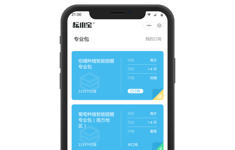 耘小(xiǎo)寶環境監測儀內(nèi)含不(bù)同作(zuò)物(wù)的(de)生(shēng)産技(jì)術(™shù)包,用(yòng)戶可(kě)根據需求選擇相(xiàng)關作(zuò)物(wù)技(jì)術(shù)包,啓動技(jì)術(shù)包後,用(yòng)φ戶可(kě)及時(shí)收到(dào)作(zuò)物(wù)全生(shēng)長(cháng)周期,以及不(bù)同氣候環境條件(jiàn)下(xià)的(de)關鍵技(jì©)術(shù)指導。